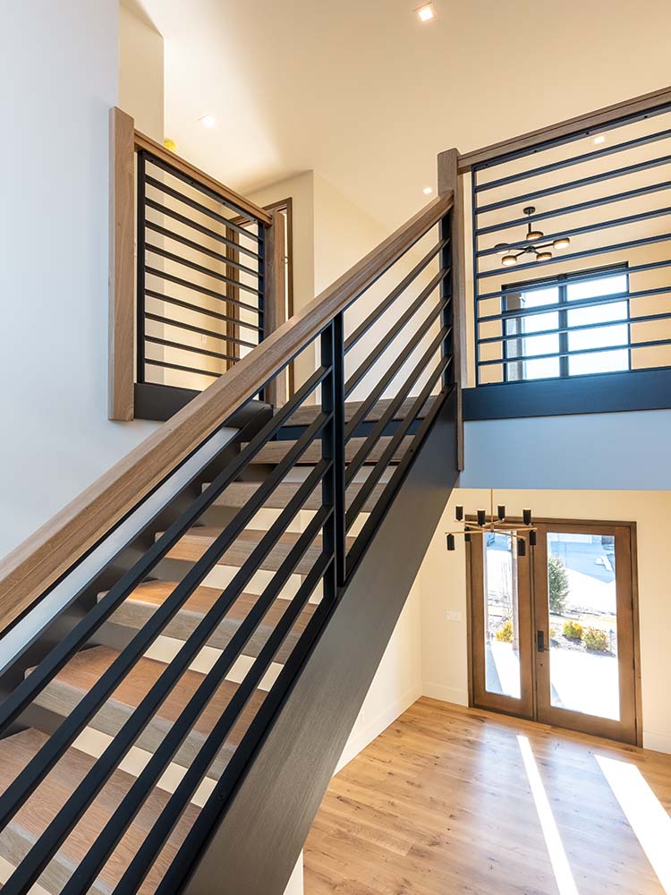 Custom white oak staircase with open treads and unique hand rail with metal panels