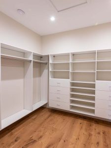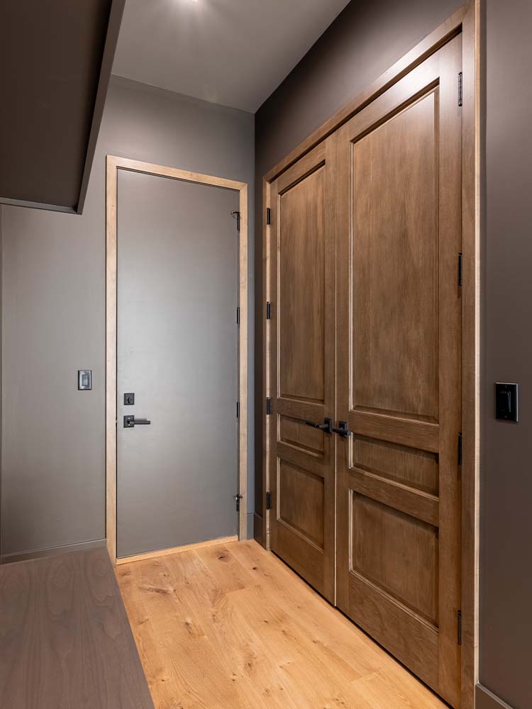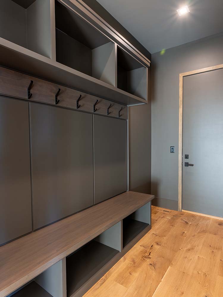 Custom Locker with walnut accents, painted a dark moody color on walls and ceiling