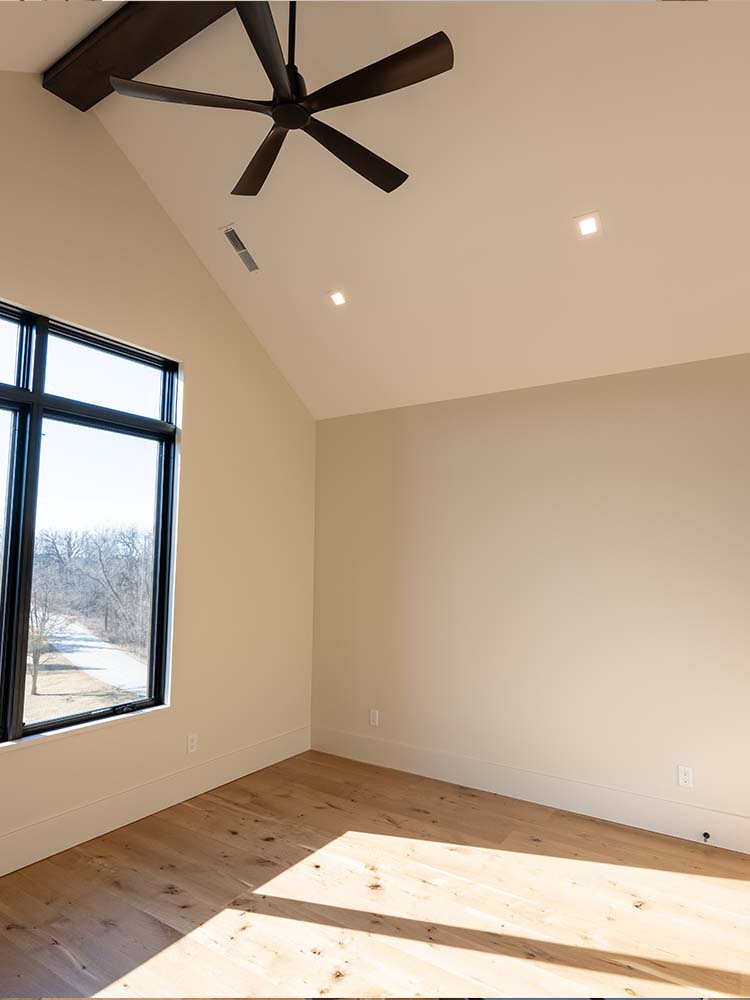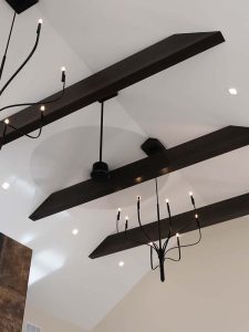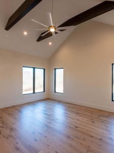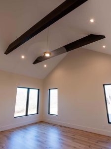 16’ Cathedral ceiling with collar tie beams and large modern fan