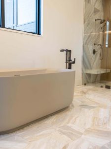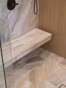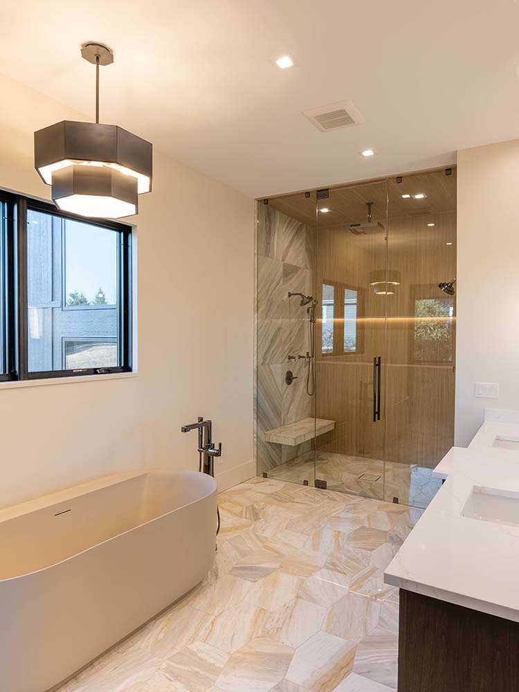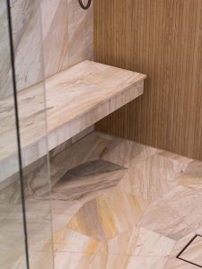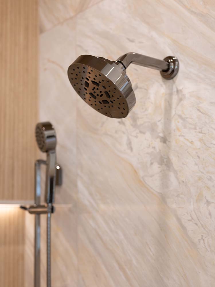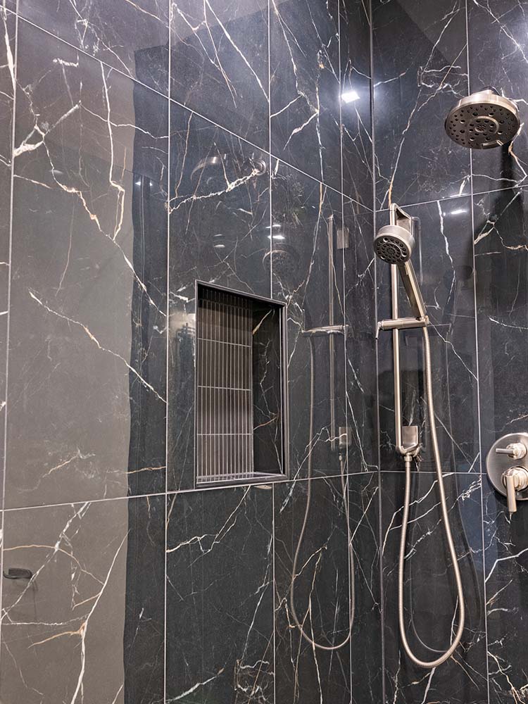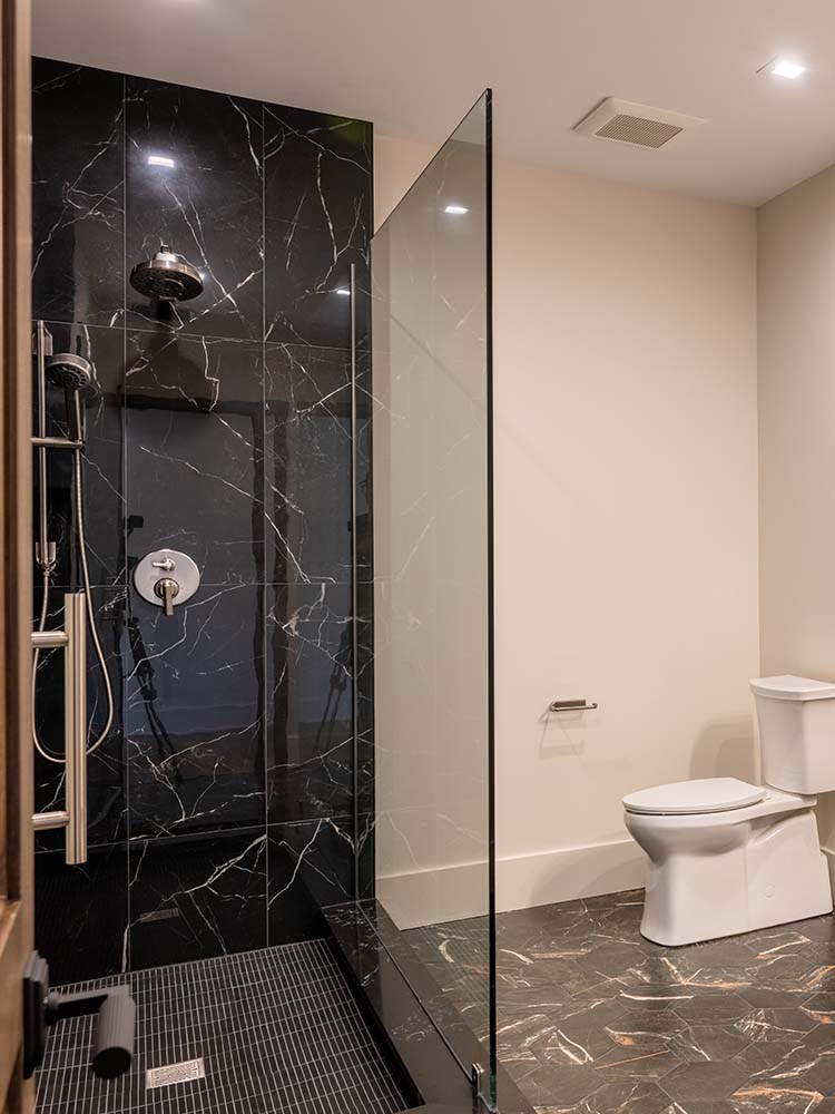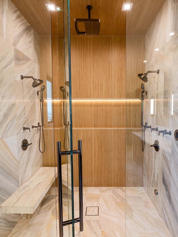 Large walk-in shower with large format porcelain and marble tile floor and walls, floor to ceiling shower doors, steamer, 2 showerheads and handhelds, rain can