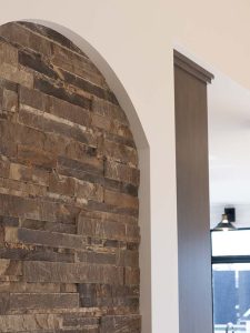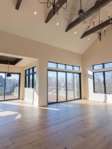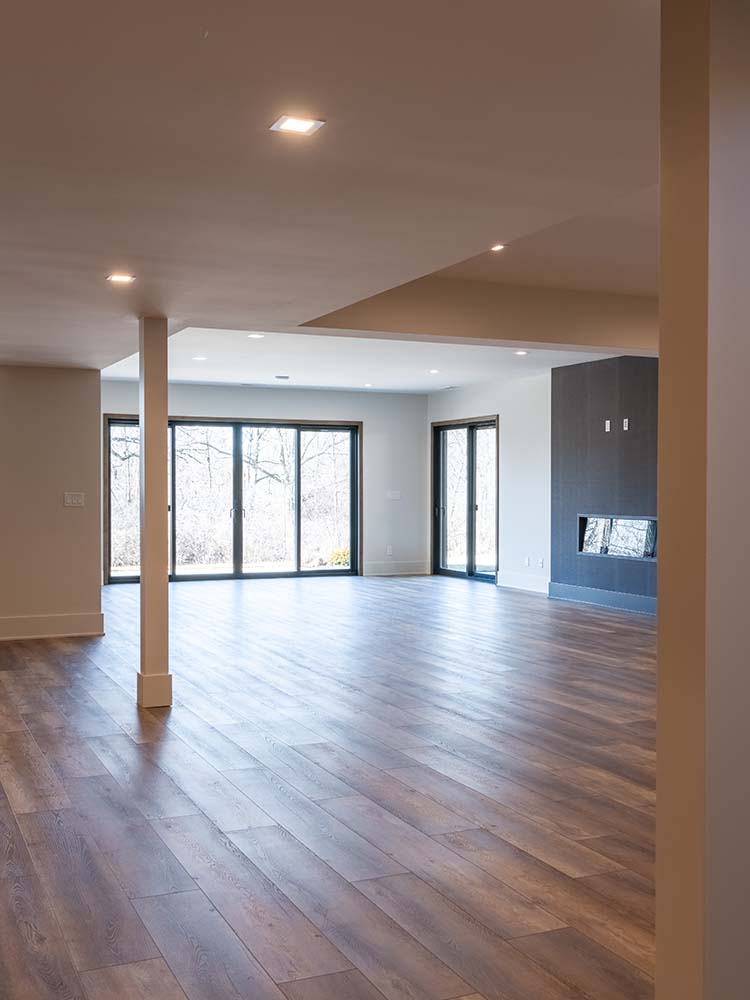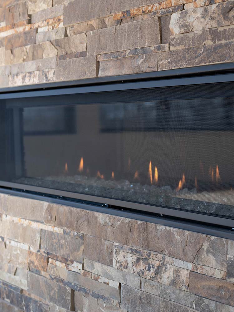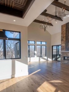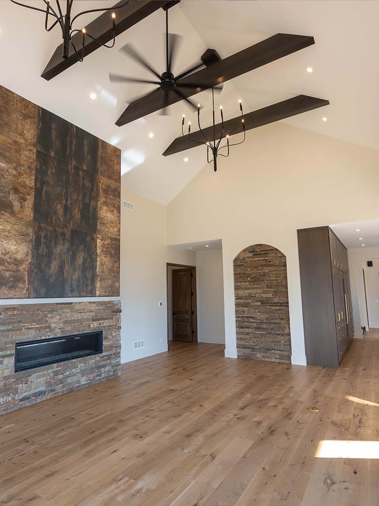 18’ cathedral ceiling in great room featuring a linear fireplace with ledger stone and tile