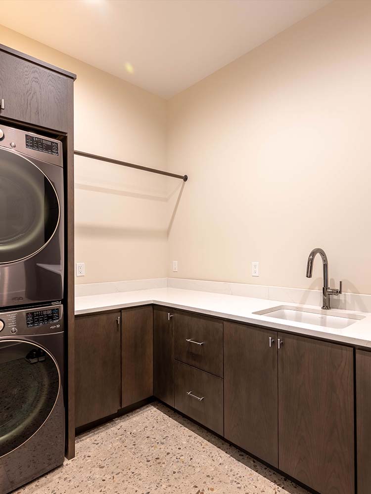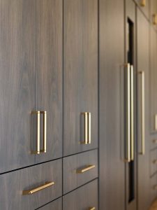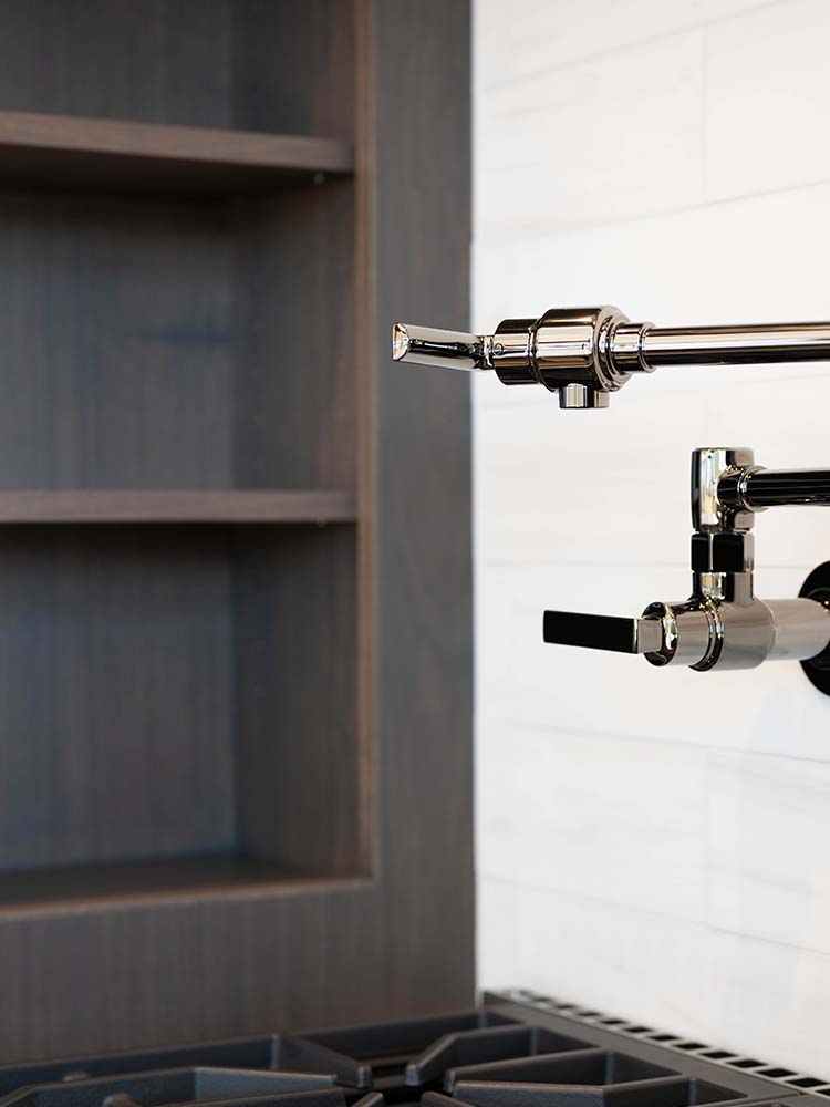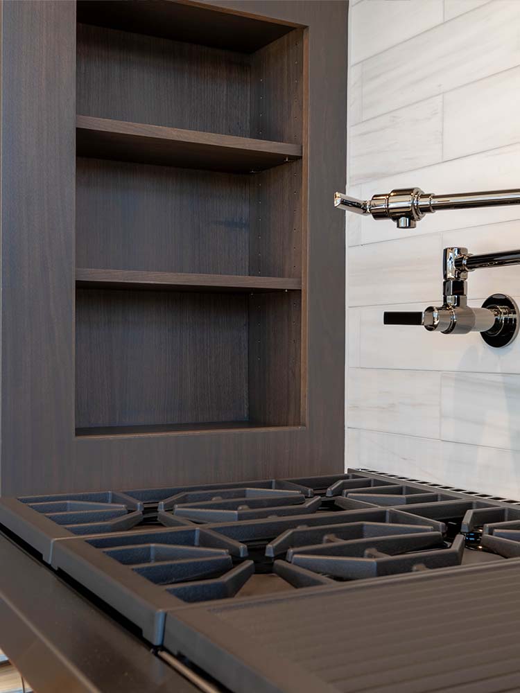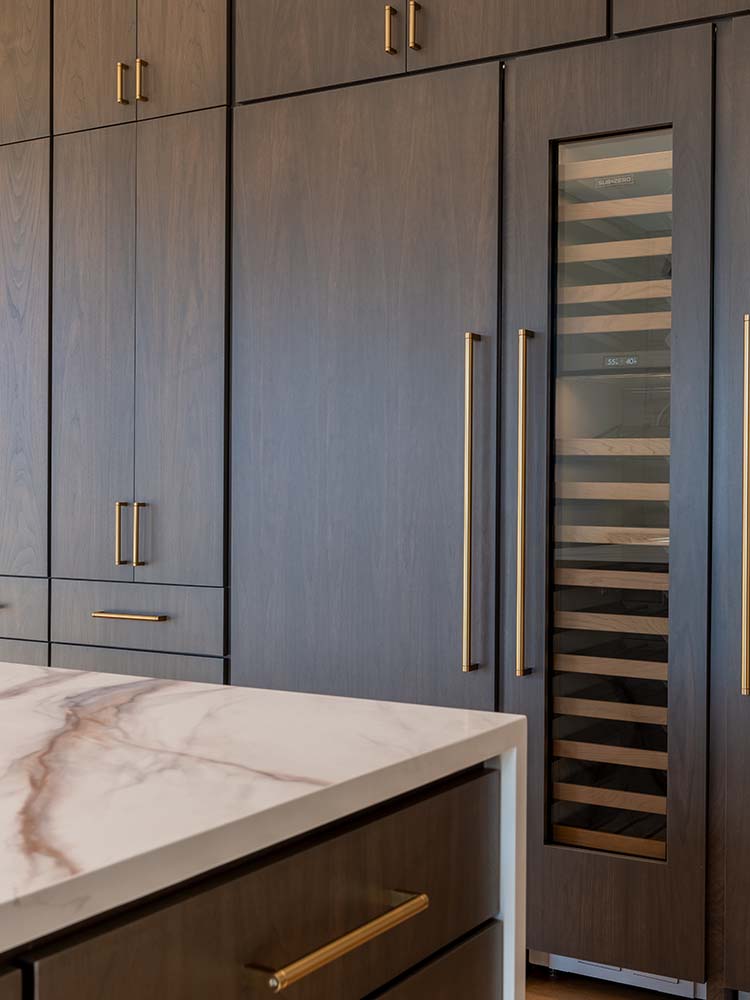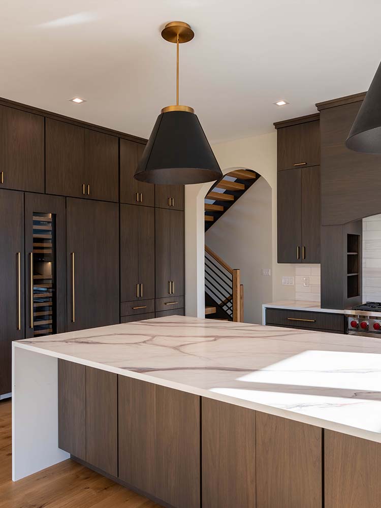 Kitchen with custom cabinets in a rich stained walnut sllab doors and drawers