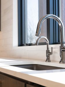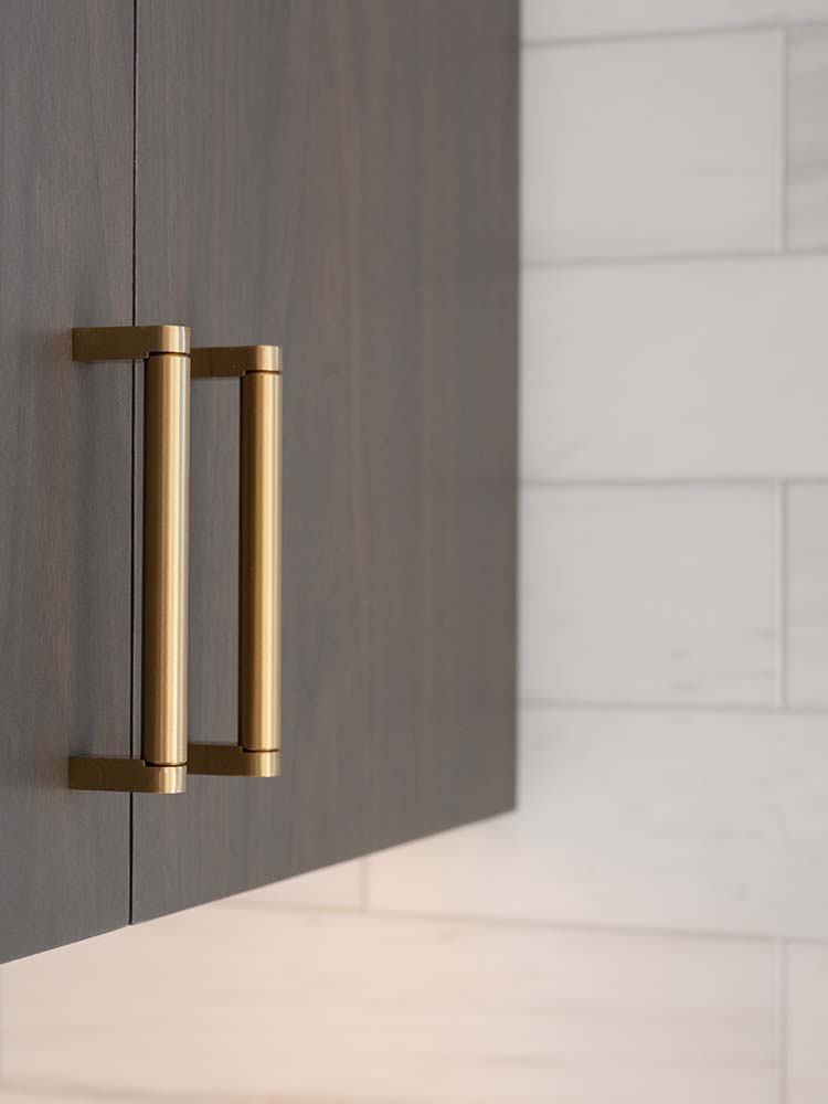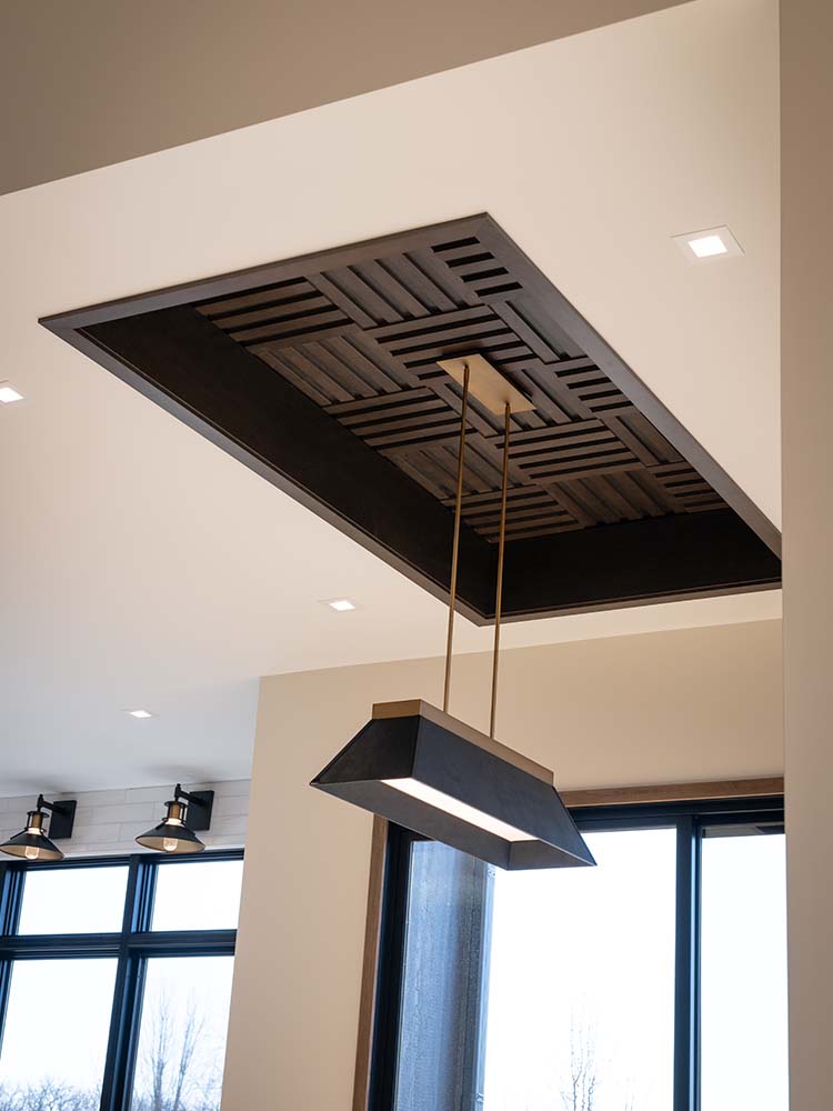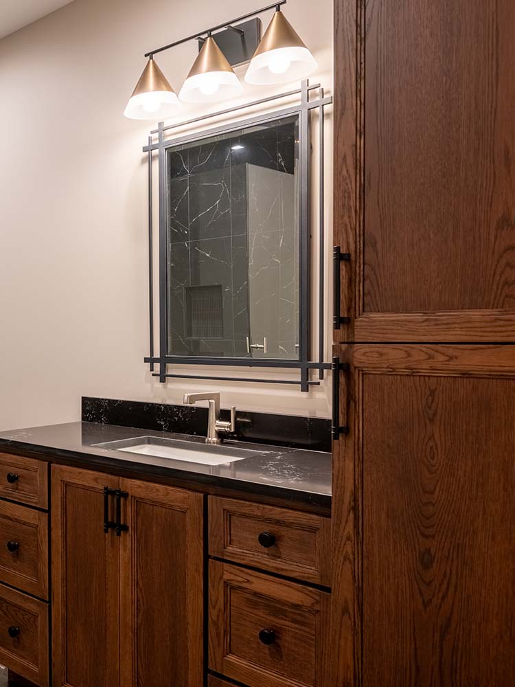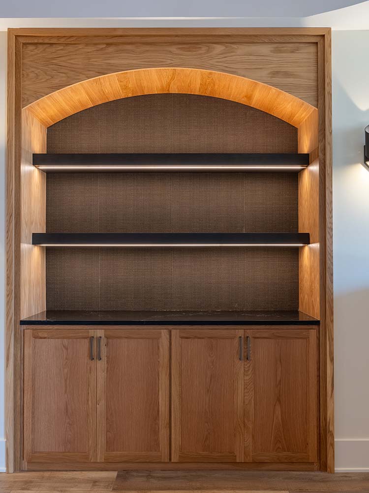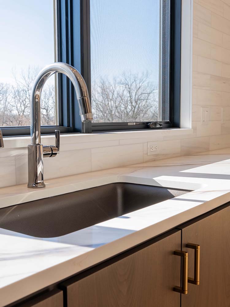 Kitchen with custom cabinets in a rich stained walnut sllab doors and drawers