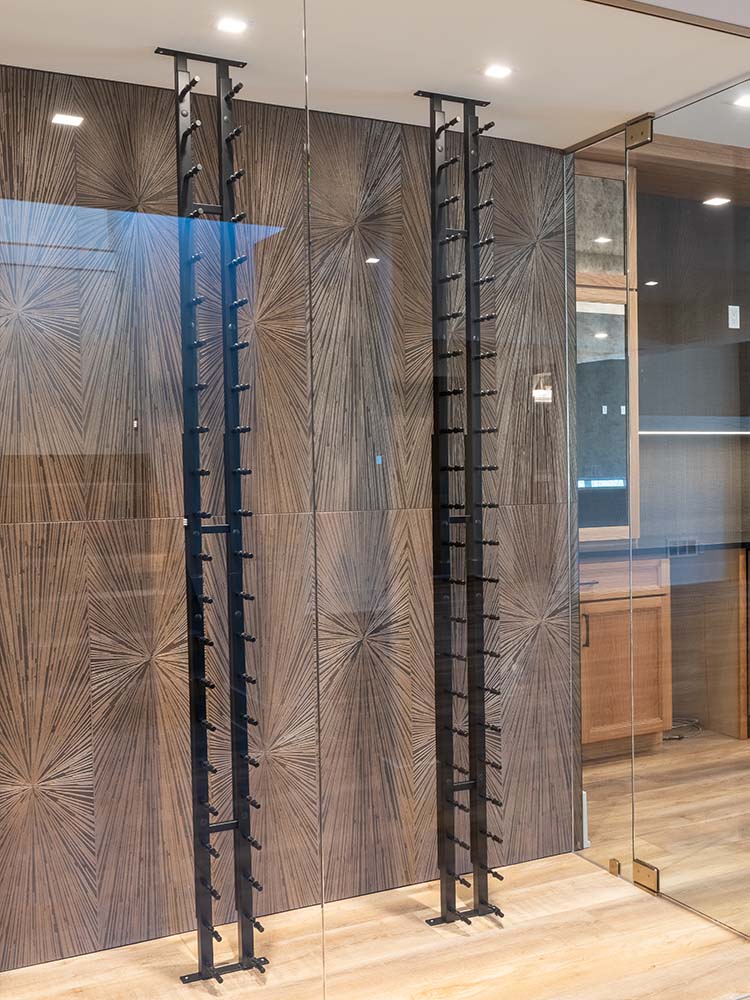 Wine room with starburst tile accent wall with floor to ceiling glass with a door